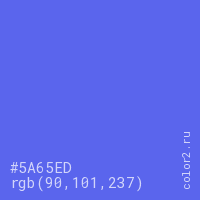 Цвет #5A65ED в цветовой модели RGB обозначается тремя октетами (90, 101, 237) в десятичном формате и #5A65ED в шестнадцатиричном (hex) формате, которые являются интенсивностью красного 90 (hex 5A), интенсивность зелёного 101 (hex 65) и интенсивность синего 237 (hex ED).