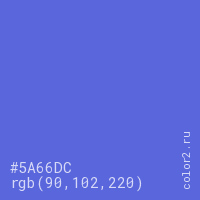 Цвет #5A66DC в цветовой модели RGB обозначается тремя октетами (90, 102, 220) в десятичном формате и #5A66DC в шестнадцатиричном (hex) формате, которые являются интенсивностью красного 90 (hex 5A), интенсивность зелёного 102 (hex 66) и интенсивность синего 220 (hex DC).