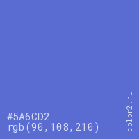 Цвет #5A6CD2 в цветовой модели RGB обозначается тремя октетами (90, 108, 210) в десятичном формате и #5A6CD2 в шестнадцатиричном (hex) формате, которые являются интенсивностью красного 90 (hex 5A), интенсивность зелёного 108 (hex 6C) и интенсивность синего 210 (hex D2).