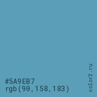 Цвет #5A9EB7 в цветовой модели RGB обозначается тремя октетами (90, 158, 183) в десятичном формате и #5A9EB7 в шестнадцатиричном (hex) формате, которые являются интенсивностью красного 90 (hex 5A), интенсивность зелёного 158 (hex 9E) и интенсивность синего 183 (hex B7).