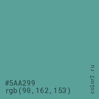 Цвет #5AA299 в цветовой модели RGB обозначается тремя октетами (90, 162, 153) в десятичном формате и #5AA299 в шестнадцатиричном (hex) формате, которые являются интенсивностью красного 90 (hex 5A), интенсивность зелёного 162 (hex A2) и интенсивность синего 153 (hex 99).