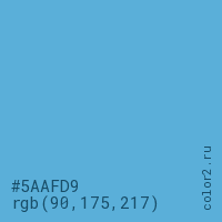 Цвет #5AAFD9 в цветовой модели RGB обозначается тремя октетами (90, 175, 217) в десятичном формате и #5AAFD9 в шестнадцатиричном (hex) формате, которые являются интенсивностью красного 90 (hex 5A), интенсивность зелёного 175 (hex AF) и интенсивность синего 217 (hex D9).