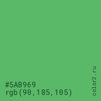 Цвет #5AB969 в цветовой модели RGB обозначается тремя октетами (90, 185, 105) в десятичном формате и #5AB969 в шестнадцатиричном (hex) формате, которые являются интенсивностью красного 90 (hex 5A), интенсивность зелёного 185 (hex B9) и интенсивность синего 105 (hex 69).