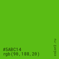 Цвет #5ABC14 в цветовой модели RGB обозначается тремя октетами (90, 188, 20) в десятичном формате и #5ABC14 в шестнадцатиричном (hex) формате, которые являются интенсивностью красного 90 (hex 5A), интенсивность зелёного 188 (hex BC) и интенсивность синего 20 (hex 14).