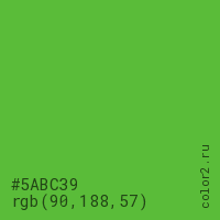 Цвет #5ABC39 в цветовой модели RGB обозначается тремя октетами (90, 188, 57) в десятичном формате и #5ABC39 в шестнадцатиричном (hex) формате, которые являются интенсивностью красного 90 (hex 5A), интенсивность зелёного 188 (hex BC) и интенсивность синего 57 (hex 39).