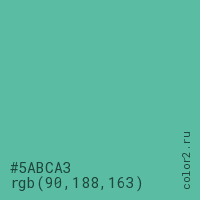 Цвет #5ABCA3 в цветовой модели RGB обозначается тремя октетами (90, 188, 163) в десятичном формате и #5ABCA3 в шестнадцатиричном (hex) формате, которые являются интенсивностью красного 90 (hex 5A), интенсивность зелёного 188 (hex BC) и интенсивность синего 163 (hex A3).