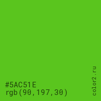 Цвет #5AC51E в цветовой модели RGB обозначается тремя октетами (90, 197, 30) в десятичном формате и #5AC51E в шестнадцатиричном (hex) формате, которые являются интенсивностью красного 90 (hex 5A), интенсивность зелёного 197 (hex C5) и интенсивность синего 30 (hex 1E).