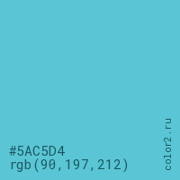 Цвет #5AC5D4 в цветовой модели RGB обозначается тремя октетами (90, 197, 212) в десятичном формате и #5AC5D4 в шестнадцатиричном (hex) формате, которые являются интенсивностью красного 90 (hex 5A), интенсивность зелёного 197 (hex C5) и интенсивность синего 212 (hex D4).