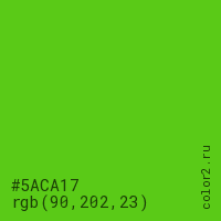 Цвет #5ACA17 в цветовой модели RGB обозначается тремя октетами (90, 202, 23) в десятичном формате и #5ACA17 в шестнадцатиричном (hex) формате, которые являются интенсивностью красного 90 (hex 5A), интенсивность зелёного 202 (hex CA) и интенсивность синего 23 (hex 17).