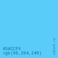 Цвет #5ACCF9 в цветовой модели RGB обозначается тремя октетами (90, 204, 249) в десятичном формате и #5ACCF9 в шестнадцатиричном (hex) формате, которые являются интенсивностью красного 90 (hex 5A), интенсивность зелёного 204 (hex CC) и интенсивность синего 249 (hex F9).