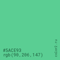Цвет #5ACE93 в цветовой модели RGB обозначается тремя октетами (90, 206, 147) в десятичном формате и #5ACE93 в шестнадцатиричном (hex) формате, которые являются интенсивностью красного 90 (hex 5A), интенсивность зелёного 206 (hex CE) и интенсивность синего 147 (hex 93).