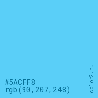 Цвет #5ACFF8 в цветовой модели RGB обозначается тремя октетами (90, 207, 248) в десятичном формате и #5ACFF8 в шестнадцатиричном (hex) формате, которые являются интенсивностью красного 90 (hex 5A), интенсивность зелёного 207 (hex CF) и интенсивность синего 248 (hex F8).