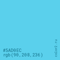 Цвет #5AD0EC в цветовой модели RGB обозначается тремя октетами (90, 208, 236) в десятичном формате и #5AD0EC в шестнадцатиричном (hex) формате, которые являются интенсивностью красного 90 (hex 5A), интенсивность зелёного 208 (hex D0) и интенсивность синего 236 (hex EC).
