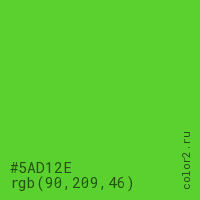 Цвет #5AD12E в цветовой модели RGB обозначается тремя октетами (90, 209, 46) в десятичном формате и #5AD12E в шестнадцатиричном (hex) формате, которые являются интенсивностью красного 90 (hex 5A), интенсивность зелёного 209 (hex D1) и интенсивность синего 46 (hex 2E).