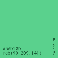 Цвет #5AD18D в цветовой модели RGB обозначается тремя октетами (90, 209, 141) в десятичном формате и #5AD18D в шестнадцатиричном (hex) формате, которые являются интенсивностью красного 90 (hex 5A), интенсивность зелёного 209 (hex D1) и интенсивность синего 141 (hex 8D).