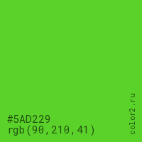 Цвет #5AD229 в цветовой модели RGB обозначается тремя октетами (90, 210, 41) в десятичном формате и #5AD229 в шестнадцатиричном (hex) формате, которые являются интенсивностью красного 90 (hex 5A), интенсивность зелёного 210 (hex D2) и интенсивность синего 41 (hex 29).
