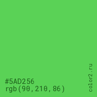 Цвет #5AD256 в цветовой модели RGB обозначается тремя октетами (90, 210, 86) в десятичном формате и #5AD256 в шестнадцатиричном (hex) формате, которые являются интенсивностью красного 90 (hex 5A), интенсивность зелёного 210 (hex D2) и интенсивность синего 86 (hex 56).