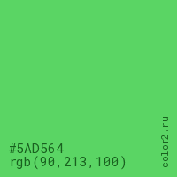 Цвет #5AD564 в цветовой модели RGB обозначается тремя октетами (90, 213, 100) в десятичном формате и #5AD564 в шестнадцатиричном (hex) формате, которые являются интенсивностью красного 90 (hex 5A), интенсивность зелёного 213 (hex D5) и интенсивность синего 100 (hex 64).