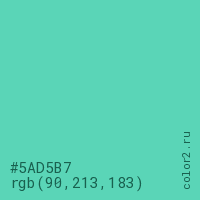 Цвет #5AD5B7 в цветовой модели RGB обозначается тремя октетами (90, 213, 183) в десятичном формате и #5AD5B7 в шестнадцатиричном (hex) формате, которые являются интенсивностью красного 90 (hex 5A), интенсивность зелёного 213 (hex D5) и интенсивность синего 183 (hex B7).