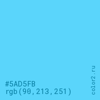 Цвет #5AD5FB в цветовой модели RGB обозначается тремя октетами (90, 213, 251) в десятичном формате и #5AD5FB в шестнадцатиричном (hex) формате, которые являются интенсивностью красного 90 (hex 5A), интенсивность зелёного 213 (hex D5) и интенсивность синего 251 (hex FB).