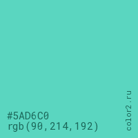 Цвет #5AD6C0 в цветовой модели RGB обозначается тремя октетами (90, 214, 192) в десятичном формате и #5AD6C0 в шестнадцатиричном (hex) формате, которые являются интенсивностью красного 90 (hex 5A), интенсивность зелёного 214 (hex D6) и интенсивность синего 192 (hex C0).
