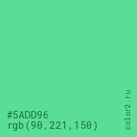 Цвет #5ADD96 в цветовой модели RGB обозначается тремя октетами (90, 221, 150) в десятичном формате и #5ADD96 в шестнадцатиричном (hex) формате, которые являются интенсивностью красного 90 (hex 5A), интенсивность зелёного 221 (hex DD) и интенсивность синего 150 (hex 96).