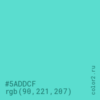 Цвет #5ADDCF в цветовой модели RGB обозначается тремя октетами (90, 221, 207) в десятичном формате и #5ADDCF в шестнадцатиричном (hex) формате, которые являются интенсивностью красного 90 (hex 5A), интенсивность зелёного 221 (hex DD) и интенсивность синего 207 (hex CF).