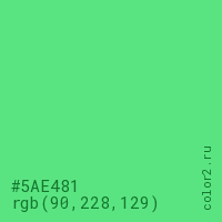 Цвет #5AE481 в цветовой модели RGB обозначается тремя октетами (90, 228, 129) в десятичном формате и #5AE481 в шестнадцатиричном (hex) формате, которые являются интенсивностью красного 90 (hex 5A), интенсивность зелёного 228 (hex E4) и интенсивность синего 129 (hex 81).