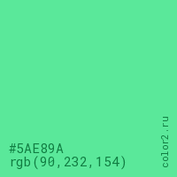 Цвет #5AE89A в цветовой модели RGB обозначается тремя октетами (90, 232, 154) в десятичном формате и #5AE89A в шестнадцатиричном (hex) формате, которые являются интенсивностью красного 90 (hex 5A), интенсивность зелёного 232 (hex E8) и интенсивность синего 154 (hex 9A).