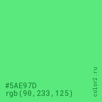 Цвет #5AE97D в цветовой модели RGB обозначается тремя октетами (90, 233, 125) в десятичном формате и #5AE97D в шестнадцатиричном (hex) формате, которые являются интенсивностью красного 90 (hex 5A), интенсивность зелёного 233 (hex E9) и интенсивность синего 125 (hex 7D).