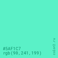 Цвет #5AF1C7 в цветовой модели RGB обозначается тремя октетами (90, 241, 199) в десятичном формате и #5AF1C7 в шестнадцатиричном (hex) формате, которые являются интенсивностью красного 90 (hex 5A), интенсивность зелёного 241 (hex F1) и интенсивность синего 199 (hex C7).