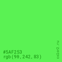 Цвет #5AF253 в цветовой модели RGB обозначается тремя октетами (90, 242, 83) в десятичном формате и #5AF253 в шестнадцатиричном (hex) формате, которые являются интенсивностью красного 90 (hex 5A), интенсивность зелёного 242 (hex F2) и интенсивность синего 83 (hex 53).