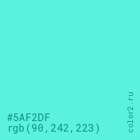 Цвет #5AF2DF в цветовой модели RGB обозначается тремя октетами (90, 242, 223) в десятичном формате и #5AF2DF в шестнадцатиричном (hex) формате, которые являются интенсивностью красного 90 (hex 5A), интенсивность зелёного 242 (hex F2) и интенсивность синего 223 (hex DF).