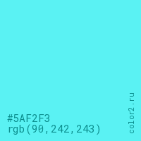 Цвет #5AF2F3 в цветовой модели RGB обозначается тремя октетами (90, 242, 243) в десятичном формате и #5AF2F3 в шестнадцатиричном (hex) формате, которые являются интенсивностью красного 90 (hex 5A), интенсивность зелёного 242 (hex F2) и интенсивность синего 243 (hex F3).
