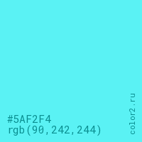 Цвет #5AF2F4 в цветовой модели RGB обозначается тремя октетами (90, 242, 244) в десятичном формате и #5AF2F4 в шестнадцатиричном (hex) формате, которые являются интенсивностью красного 90 (hex 5A), интенсивность зелёного 242 (hex F2) и интенсивность синего 244 (hex F4).