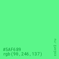 Цвет #5AF689 в цветовой модели RGB обозначается тремя октетами (90, 246, 137) в десятичном формате и #5AF689 в шестнадцатиричном (hex) формате, которые являются интенсивностью красного 90 (hex 5A), интенсивность зелёного 246 (hex F6) и интенсивность синего 137 (hex 89).