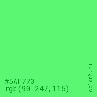 Цвет #5AF773 в цветовой модели RGB обозначается тремя октетами (90, 247, 115) в десятичном формате и #5AF773 в шестнадцатиричном (hex) формате, которые являются интенсивностью красного 90 (hex 5A), интенсивность зелёного 247 (hex F7) и интенсивность синего 115 (hex 73).