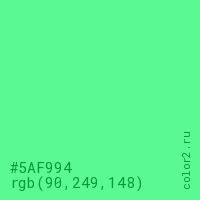 Цвет #5AF994 в цветовой модели RGB обозначается тремя октетами (90, 249, 148) в десятичном формате и #5AF994 в шестнадцатиричном (hex) формате, которые являются интенсивностью красного 90 (hex 5A), интенсивность зелёного 249 (hex F9) и интенсивность синего 148 (hex 94).
