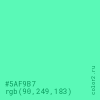 Цвет #5AF9B7 в цветовой модели RGB обозначается тремя октетами (90, 249, 183) в десятичном формате и #5AF9B7 в шестнадцатиричном (hex) формате, которые являются интенсивностью красного 90 (hex 5A), интенсивность зелёного 249 (hex F9) и интенсивность синего 183 (hex B7).