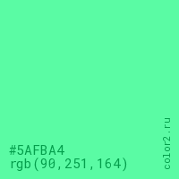 Цвет #5AFBA4 в цветовой модели RGB обозначается тремя октетами (90, 251, 164) в десятичном формате и #5AFBA4 в шестнадцатиричном (hex) формате, которые являются интенсивностью красного 90 (hex 5A), интенсивность зелёного 251 (hex FB) и интенсивность синего 164 (hex A4).