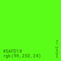 Цвет #5AFD18 в цветовой модели RGB обозначается тремя октетами (90, 253, 24) в десятичном формате и #5AFD18 в шестнадцатиричном (hex) формате, которые являются интенсивностью красного 90 (hex 5A), интенсивность зелёного 253 (hex FD) и интенсивность синего 24 (hex 18).