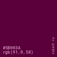 Цвет #5B003A в цветовой модели RGB обозначается тремя октетами (91, 0, 58) в десятичном формате и #5B003A в шестнадцатиричном (hex) формате, которые являются интенсивностью красного 91 (hex 5B), интенсивность зелёного 0 (hex 00) и интенсивность синего 58 (hex 3A).