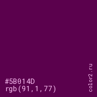 Цвет #5B014D в цветовой модели RGB обозначается тремя октетами (91, 1, 77) в десятичном формате и #5B014D в шестнадцатиричном (hex) формате, которые являются интенсивностью красного 91 (hex 5B), интенсивность зелёного 1 (hex 01) и интенсивность синего 77 (hex 4D).