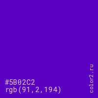 Цвет #5B02C2 в цветовой модели RGB обозначается тремя октетами (91, 2, 194) в десятичном формате и #5B02C2 в шестнадцатиричном (hex) формате, которые являются интенсивностью красного 91 (hex 5B), интенсивность зелёного 2 (hex 02) и интенсивность синего 194 (hex C2).