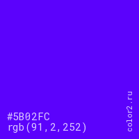 Цвет #5B02FC в цветовой модели RGB обозначается тремя октетами (91, 2, 252) в десятичном формате и #5B02FC в шестнадцатиричном (hex) формате, которые являются интенсивностью красного 91 (hex 5B), интенсивность зелёного 2 (hex 02) и интенсивность синего 252 (hex FC).