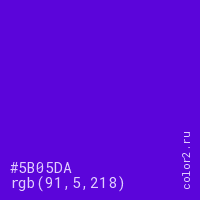 Цвет #5B05DA в цветовой модели RGB обозначается тремя октетами (91, 5, 218) в десятичном формате и #5B05DA в шестнадцатиричном (hex) формате, которые являются интенсивностью красного 91 (hex 5B), интенсивность зелёного 5 (hex 05) и интенсивность синего 218 (hex DA).