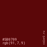 Цвет #5B0709 в цветовой модели RGB обозначается тремя октетами (91, 7, 9) в десятичном формате и #5B0709 в шестнадцатиричном (hex) формате, которые являются интенсивностью красного 91 (hex 5B), интенсивность зелёного 7 (hex 07) и интенсивность синего 9 (hex 09).