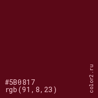 Цвет #5B0817 в цветовой модели RGB обозначается тремя октетами (91, 8, 23) в десятичном формате и #5B0817 в шестнадцатиричном (hex) формате, которые являются интенсивностью красного 91 (hex 5B), интенсивность зелёного 8 (hex 08) и интенсивность синего 23 (hex 17).