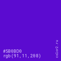 Цвет #5B0BD0 в цветовой модели RGB обозначается тремя октетами (91, 11, 208) в десятичном формате и #5B0BD0 в шестнадцатиричном (hex) формате, которые являются интенсивностью красного 91 (hex 5B), интенсивность зелёного 11 (hex 0B) и интенсивность синего 208 (hex D0).