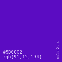 Цвет #5B0CC2 в цветовой модели RGB обозначается тремя октетами (91, 12, 194) в десятичном формате и #5B0CC2 в шестнадцатиричном (hex) формате, которые являются интенсивностью красного 91 (hex 5B), интенсивность зелёного 12 (hex 0C) и интенсивность синего 194 (hex C2).